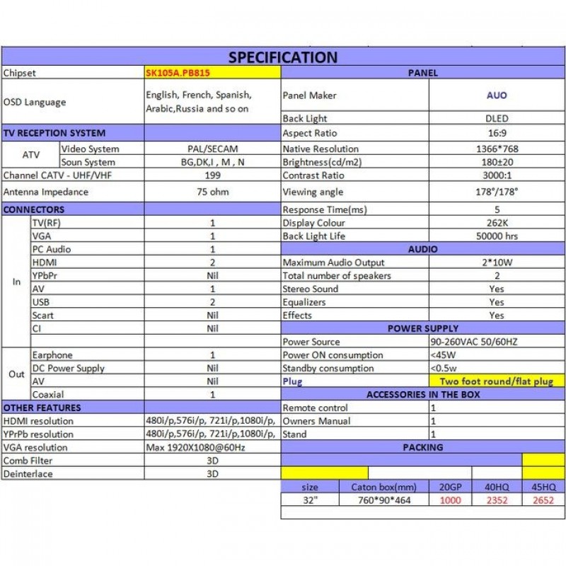 The MI+ 32" is a stylish 32-inch frameless HD TV that combines elegant design with solid performance. Powered by the SK105A.PB815 chipset and AUO panel, it delivers a sharp 1366×768 resolution, 180 nits brightness, and an ultra-wide 178° viewing angle. The TV features dual 10W speakers with stereo sound, equalizers, and sound effects, enhancing the overall multimedia experience. With support for PAL/SECAM and multiple global audio systems, it's ready for a broad international market. Extensive input options, including HDMI×2, USB×2, VGA, and AV, make this TV highly versatile for home entertainment setups.