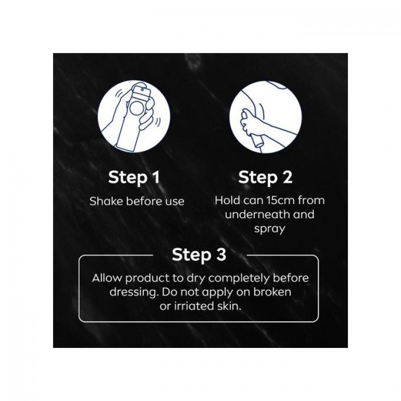 Directions: Apply in the morning or after showering. Shake well before use and then hold the can 15cm from the underarm and spray. Do not apply to broken or irritated skin. Allow product to dry completely before dressing.